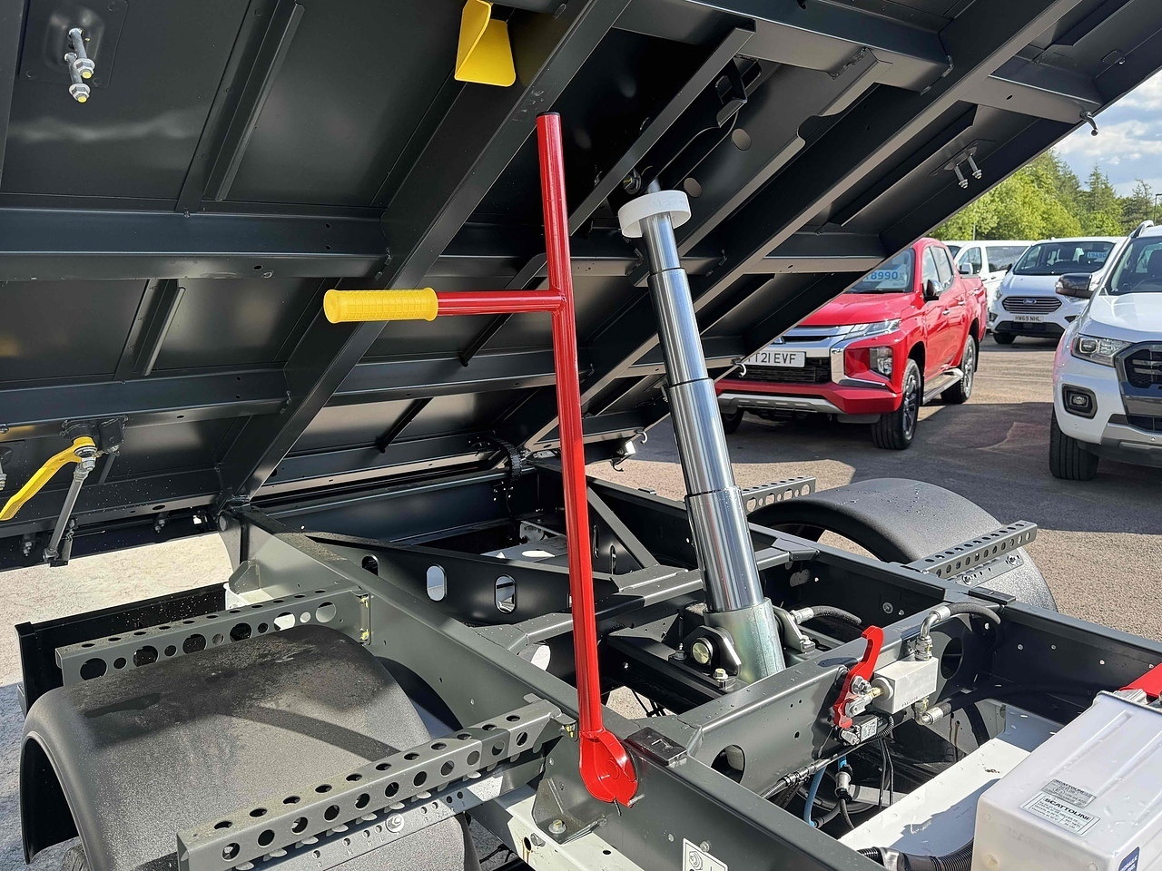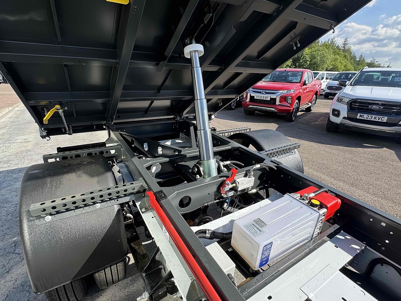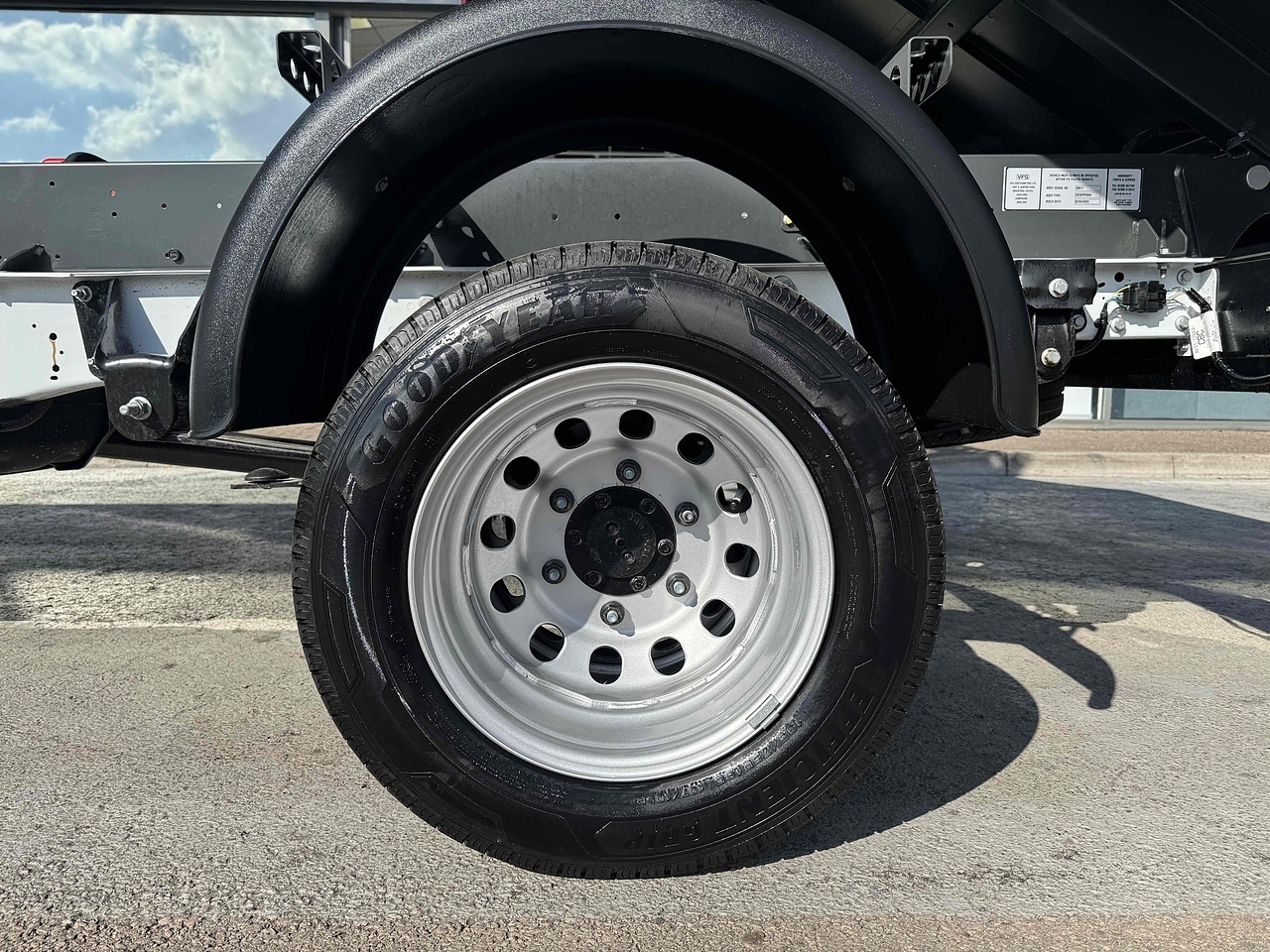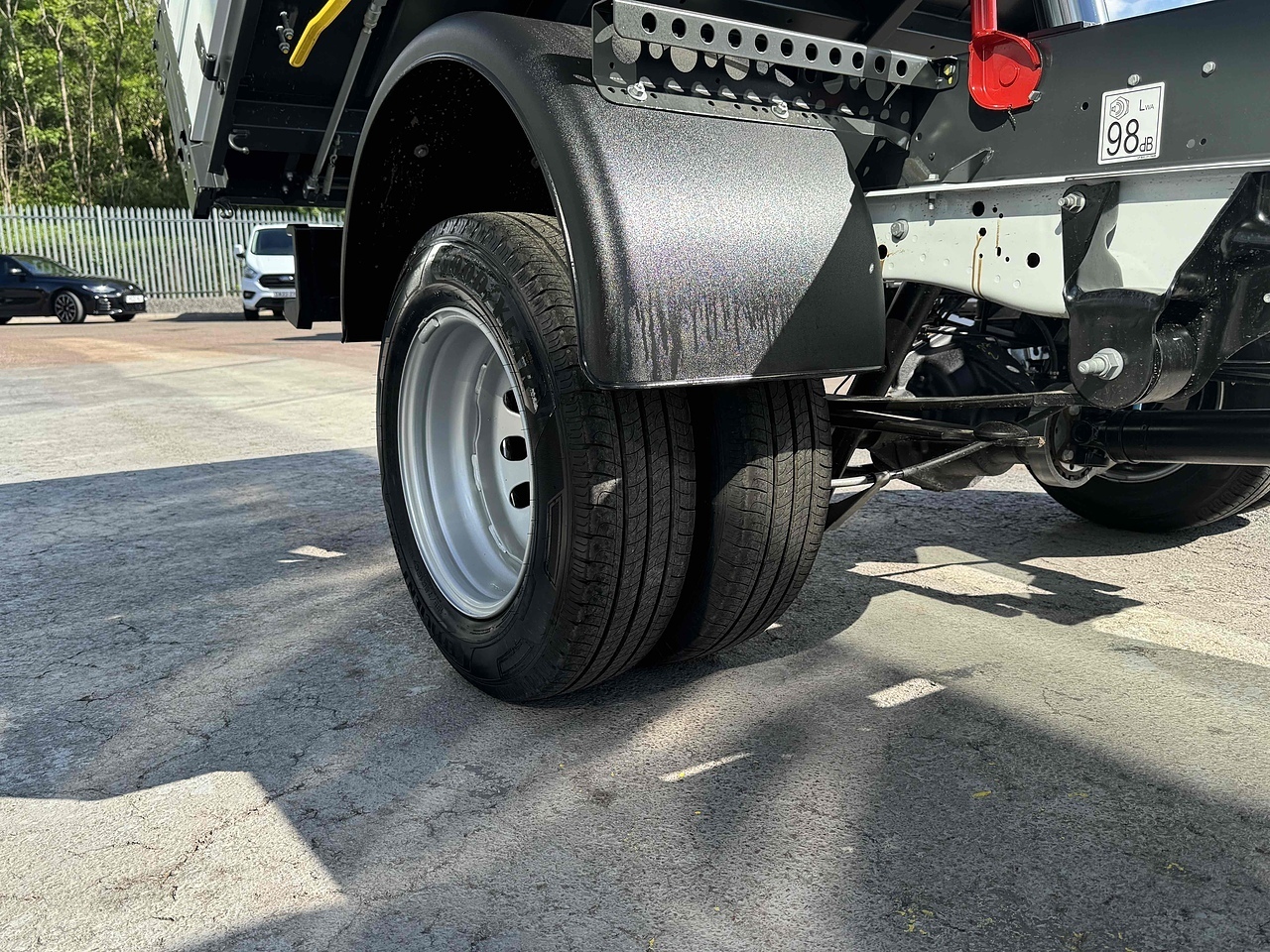 TWIN REAR WHEELS, FULL SPARE WHEEL AND SAFETY INSPECTION ARM.